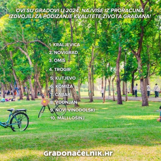 Prema najnovijim podacima Financijske agencije (FINA), hrvatski gradovi su u 2024. godini ukupno uložili više od 769 milijuna eura u projekte koji podižu kvalitetu života svojih građana uključujući ulaganja u javnu rasvjetu, vodoopskrbu, komunalnu infrastrukturu, uređenje plaža i zelenih površina, kao i gradnju i opremanje vrtića, škola i sportskih objekata.