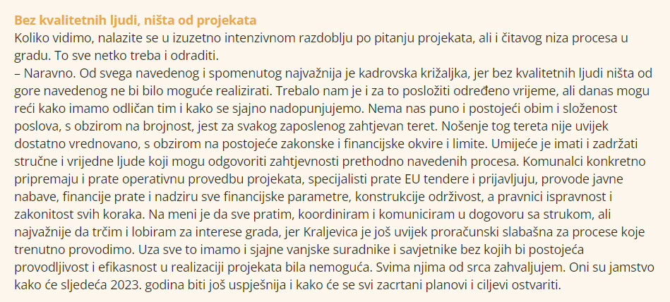 – U proteklih pet godina proveli smo i realizirali na desetke što kapitalnih, što velikih i malih projekata. U tom vremenski kratkom razdoblju u Kraljevicu je uloženo preko 100 milijuna kuna što je, pogotovo s obzirom na zatečene i raspoložive financijske potencijale, veliki uspjeh i ogroman korak u pogledu obnove, uređenja i mijenjanja slike grada nabolje. U tom smislu 2022. godina predstavlja logičnu i snažnu nadogradnju, novu, dodatnu razinu i po svim parametrima je jedna od najuspješnijih u proteklih tridesetak godina, i s obzirom na realizirane projekte, ali još više s obzirom na ugovorene poslove, osigurana sredstva financiranja za provedbe projekata, kao i s obzirom na konkretne projektne pripreme za čitav niz kapitalnih ulaganja koja će uslijediti. Poznavajući iz prve ruke trenutne procese, već sada sa sigurnošću mogu reći kako će svaka sljedeća godina biti uspješnija od prethodne i godine na izmaku.
