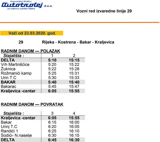 Po nalogu Nacionalnog Stožera civilne zaštite, KD Autotrolej je uspostavio izvanredne linije javnog gradskog prijevoza koje u promet kreću u ponedjeljak, 23. ožujka 2020. godine. Uspostavljene linije namijenjene su isključivo i samo građanima koji moraju doći na radno mjesto. Prijevoz za sve ostale korisnike je strogo zabranjen i ulaz u vozila bit će im onemogućen.
