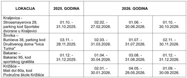 Lokacije i termini na kojima će se nalaziti mobilno reciklažno dvorište prikazani su u tablici u nastavku:
