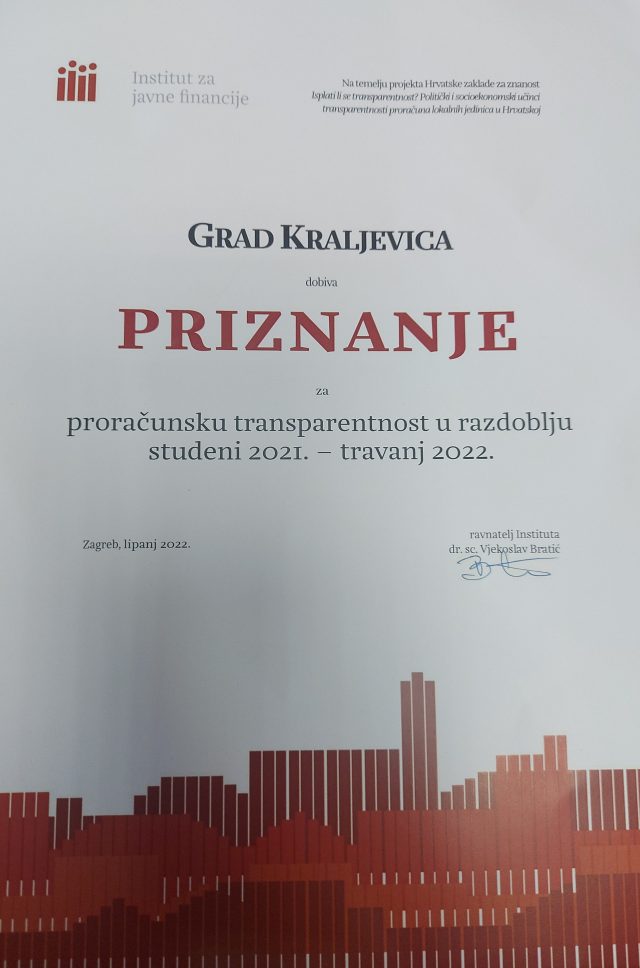 Grad Kraljevica ponovno je dobitnik najviše ocjene (5) za razinu proračunske transparentnosti koju dodjeljuje Institut za javne financije čime se svrstava među najtransparentnije gradove u Hrvatskoj.