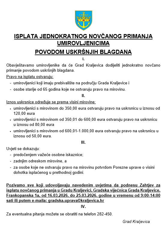 Grad Kraljevica ove će godine svojim umirovljenicima dodijeliti uskrsnice povodom uskršnjih blagdana.